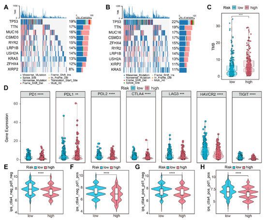 Gene mutation landscape and immunotherapy susceptibility. Mutation profile of the top 10 genes in the (A) low- and (B) high-risk group. (C) Mutational burden in the two subgroups. (D) PD-1, PD-L1, PD-L2, CTLA-4, LAG3, HAVCR2, and TIGIT expression differences in the two subgroups. Immune therapy scores in the two subgroups: (E) no immunotherapy, (F) anti-PD-1therapy, (G) anti-CTLA-4 therapy, (H) anti-PD-1, and anti-CTLA-4 therapy. “ns”: no statistical significance; “**”: p < 0.01; “***”: p < 0.001; “****”: p < 0.0001.
