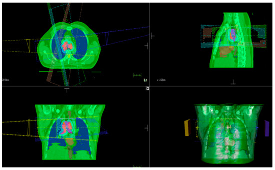 The patient received sequential CRT, which involved administering vinorelbine at a dose of 30 mg/m2 on days 1 and 8 every 21 days, along with cisplatin at a dose of 75 mg/m2 on day 1 every 21 days for a total of four cycles. Subsequently, definitive radiotherapy was performed using 3-D CT-guided treatment planning and photon treatment on a linear accelerator. The radiotherapy targeted the mediastinal area, delivering a total dose of 60 Gy in daily fractions of 2 Gy (Figure 1).