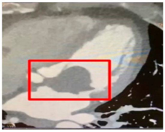 Figure 3. The echocardiogram test revealed a large left atrial mass (red square) measuring 3.6 × 4.2 cm which was attached to the interatrial septum.