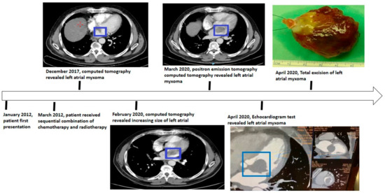 Figure 5. A schematic illustration of the patient timeline from January 2012 (diagnosis of the disease) to April 2020 (the excision of the myxoma (blue square)).