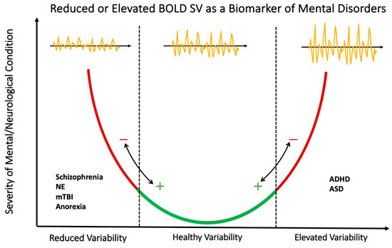 According to a study, 50% of regions with significant changes in BOLD SV in the three disorders are in the top 10% of regions with the highest or lowest variability in controls [22]. Negative correlations between the variability of the signal in a brain region and its level of activity were found. Low DMN variability was consistently identified alongside strong functional connectivity (FC) within the DMN during resting state fMRI [22].