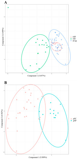 Dispersion plots of the first (PC1) and second (PC2) principal components based on the analysis of the individual C. undecimalis (A) and C. parallelus (B) using 10 microsatellite loci. The ellipses, shown in different colors, represent the analyzed individuals in two different analyses. Populations are represented in the figures with the acronyms used in this study: captive C. undecimalis (uCap) in São Paulo (uSP) and Santa Catarina (uSC); and C. parallelus in São Paulo (pSP) and Santa Catarina (pSC).