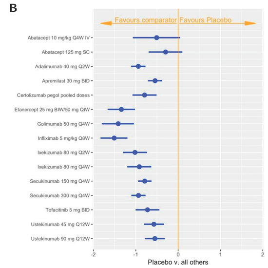A retrospective systemic literature review and network meta-analysis published in 2020 by the British Medical Journal compared the safety and efficacy of fifteen different biologic DMARDs in patients with psoriatic arthritis [30]. Figure 1A,B were created by the authors of “Efficacy and Safety of Biologics in PSORIATIC ARTHRITIS: A Systematic Literature Review and Network Meta-Analysis” and used as a reference for this study. The patient responses were compared with a placebo group of active PsA patients who were not treated with a biologic DMARD. The line thickness in Figure 1A corresponds to the total number of studies used for comparison that involved this therapy or that compared the therapy to an additional treatment or a placebo (Figure 1). The circle diameter corresponds to the total number of studies that involved the respective therapy. Figure 1B lists each therapy, including dosage with the route and frequency of administration. For Figure 1B, a negative value on the ACR standard normal scale indicates a more favorable response from the treatment group, with a positive value favoring the response from the placebo. The dark blue lines represent value ranges, with the blue dots emphasizing the mean (Figure 1).