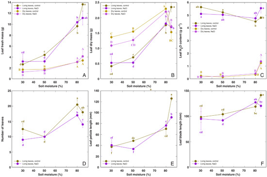 Effect of soil moisture and NaCl treatment on fresh mass of dry and living leaves (A), dry mass of dry and living leaves (B), water content in leaves (C), number of leaves (D), leaf petiole length (E), and leaf blade length (F) of Rumex hydrolapathum plants. Results represent mean values from five replicates ± SE. Different letters of the same color and the case indicate statistically significant differences (p < 0.05).