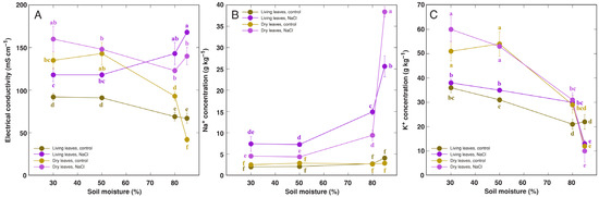 Effect of soil moisture and NaCl treatment on electrical conductivity (A), Na+ concentration (B), and K+ concentration (C) in leaf extracts of Rumex hydrolapathum plants. Results represent mean values from five replicates ± SE. Different letters of the same color indicate statistically significant differences (p < 0.05).