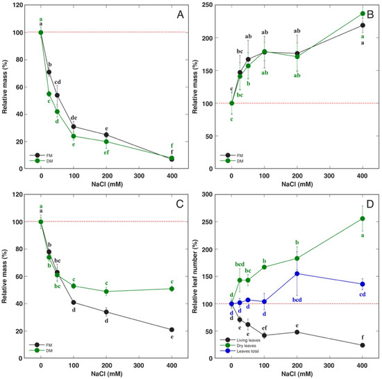 Effect of soil waterlogging with increasing concentration of NaCl on relative mass of living leaves (A), relative mass of dry leaves (B), relative mass of all leaves (C), relative leaf number (D) of Rumex hydrolapathum plants. Results represent mean values from five replicates ± SE. Different letters of the same color indicate statistically significant differences (p < 0.05). The red dotted line indicates control level.
