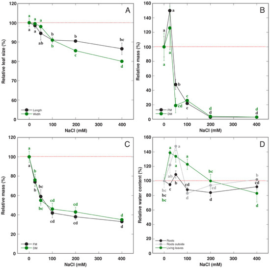 Effect of soil waterlogging with increasing concentration of NaCl on relative size of living leaves (A), relative mass of roots outside the container (B), relative mass of roots inside the container (C), relative water content in different parts (D) of Rumex hydrolapathum plants. Results represent mean values from five replicates ± SE. Different letters of the same color indicate statistically significant differences (p < 0.05). The red dotted line indicates control level.