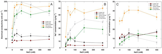 The plants treated with NaCl accumulated high concentrations of soluble ions in their leaves and roots outside the container as reflected by an increased EC (Figure 5A). The increase in EC was relatively small in fine roots and no increase was seen in large roots. Accumulation of Na+ as a result of increasing NaCl concentration was more pronounced in dry leaves, followed by roots outside the container and living leaves (Figure 5B). The accumulation potential of K+ in dry leaves was also high and significantly increased in NaCl-treated plants (Figure 5C). The leaf chlorophyll concentration was only relatively slightly increased by NaCl treatment at the later stages of plant cultivation (Figure S7A), and the chlorophyll a fluorescence parameter Performance Index tended to increase at 100–400 mM NaCl at the later stages (Figure S7B).
