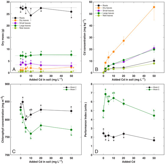 Effect of treatment with increasing concentration of Cd on dry mass of different parts (A), Cd concentration in different parts (B), leaf chlorophyll concentration (C), leaf Performance Index (D) of Rumex hydrolapathum plants. For (A,B), results represent mean values from five replicates ± SE. For (B,C), results represent mean values from 10 independent measurements for each point ± SE. Different letters of the same color indicate statistically significant differences (p < 0.05). The dotted line indicates control level.