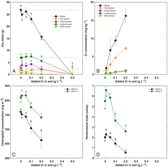 Effect of treatment with increasing concentration of Cr on dry mass of different parts (A), Cr concentration in different parts (B), leaf chlorophyll concentration (C), leaf Performance Index (D) of Rumex hydrolapathum plants. For (A,B), results represent mean values from five replicates ± SE. For (B,C), results represent mean values from 10 independent measurements for each point ± SE. Different letters of the same color indicate statistically significant differences (p < 0.05). The dotted line indicates control level.