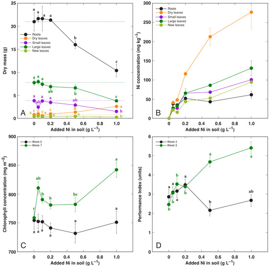 Effect of treatment with increasing concentration of Ni on dry mass of different parts (A), Ni concentration in different parts (B), leaf chlorophyll concentration (C), leaf Performance Index (D) of Rumex hydrolapathum plants. For (A,B), results represent mean values from five replicates ± SE. For (B,C), results represent mean values from 10 independent measurements for each point ± SE. Different letters of the same color indicate statistically significant differences (p < 0.05). The dotted line indicates control level.