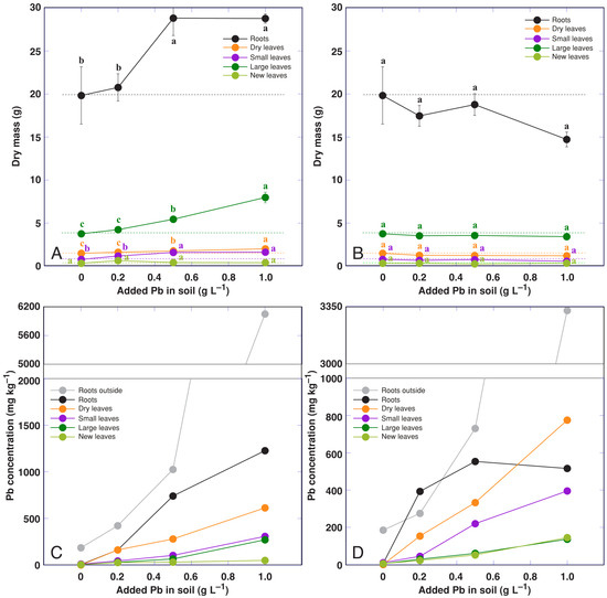 Effect of increasing concentration of Pb in the form of a nitrate on dry mass of parts (A) and Pb accumulation in different parts (C), and Pb in the form of an acetate on dry mass of parts (B) and Pb accumulation in different parts (D) of Rumex hydrolapathum plants. Results represent mean values from five replicates ± SE. Different letters of the same color indicate statistically significant differences (p < 0.05). The dotted line indicates control level.