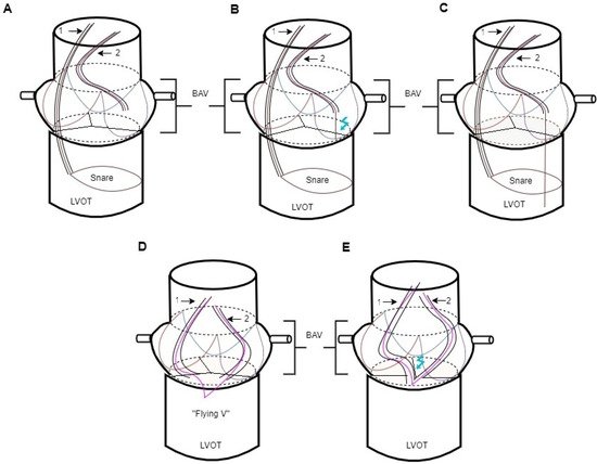 BASILICA procedure on the left aortic leaflet in a biological aortic valve. 1—MP1; 2—AL2. Steps: Amplatz Left 2 (AL2) guiding catheter is placed in the ascending aorta. Goose Neck snares are delivered into the LVOT through a Multipurpose 1 (MP1) guiding catheter (A). After the placement of an 0.014″ Astato wire into the AL2 until it reaches the lowest point of the left aortic leaflet, it is electrified before crossing over into the LVOT. (B). The 0.014″ Astato wire is snared (C). In the next step, the snare is externalized, and the “flying V” is placed (D). Injection of 5% dextrose water into both catheters results in laceration of the leaflet with the Astato wire, causing it to splay outward (E). LVOT, left ventricular outflow tract; BAV, biological aortic valve.