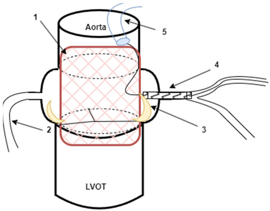 During TAVR implantation, a chimney stenting procedure is performed due to occlusion of the left coronary artery: 1—TAVR valve implanted; 2—the right coronary artery, 3—dislocated leaflet causing CAO; 4—left main stenting as a bailout strategy; and 5—Luncher guide catheter.