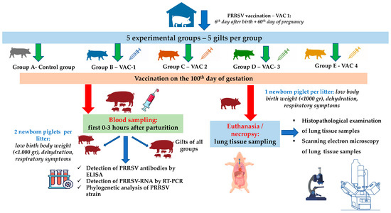 In total, 25 gilts that were RT-PCR-negative for PRRSV were equally divided into 5 groups (5 gilts per group, Figure 1). The selected gilts were of the same genetic background (commercial hybrids of Large White × Landrace), with a mean age of 174.5 ± 5.6 days and 98.8 ± 10.6 kg body weight (BW). All gilts were vaccinated with a commercial vaccine (Porcillis PRRS, MSD Animal Health, strain DV) at the 180th and 210th days of age, plus the 60th day of their first gestation.
