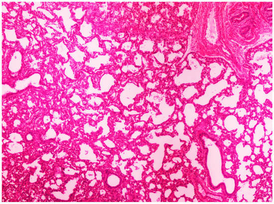 On histological examination, the lungs of all control piglets did not exhibit any microscopic lesions (Figure 4). Piglets born in group C presented interstitial edema, mild interstitial hyperemia, and diffuse thickening of the alveolar septa due to infiltration by moderate to large numbers of lymphocytes and plasma cells and fewer histiocytes. Μany alveolar spaces contained proteinaceous fluid, admixed with alveolar macrophages and/or a few neutrophils. Multifocal bronchi and bronchioli underwent epithelial hyperplasia (Figure 5, Figure 6 and Figure 7). Piglets born in groups B, D, and E exhibited the abovementioned histopathological lesions of a milder degree (Figure 8).