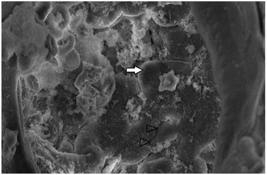 The lung tissue of RT-PCR (+) piglets was also tested under SEM. Their examination revealed accumulated proteinaceous and cellular exudates in the pulmonary alveolar spaces, leukocytes, lymphocytes, and macrophages, detected on histopathology. Pulmonary alveolar macrophages have been identified as the predominant cells supporting PRRSV replication [42]. In particular, the virus compromises its function and provokes inflammatory cell infiltration. As a result, high concentrations of leukocytes in the alveoli and bronchi are produced, and the presence of exudate is observed in the pulmonary parenchyma [44,45]. However, the SEM examination of lung tissue revealed the presence of additional lesions besides those described in the histopathological examination. Specifically, mild type II pneumocyte hyperplasia was detected histologically. This finding may be attributed to the cytopathic effect of the PRRSV-1 vaccine virus. PRRSV causes the degeneration of type I pneumocytes, and subsequent regeneration is achieved through type II pneumocyte hyperplasia [9,11]. Many researchers have recorded type II pneumocyte hyperplasia in PRRSV-infected pigs [10,41,42,43]. Therefore, previous trials confirm our findings from the examination of lung tissue under an optical microscope. Nevertheless, these researchers reported pulmonary lesions in pigs (3 weeks to 5 months old) challenged with a natural “wild” strain of PRRSV, whereas the present study revealed lesions in PRRS vaccine virus-infected newborn piglets.