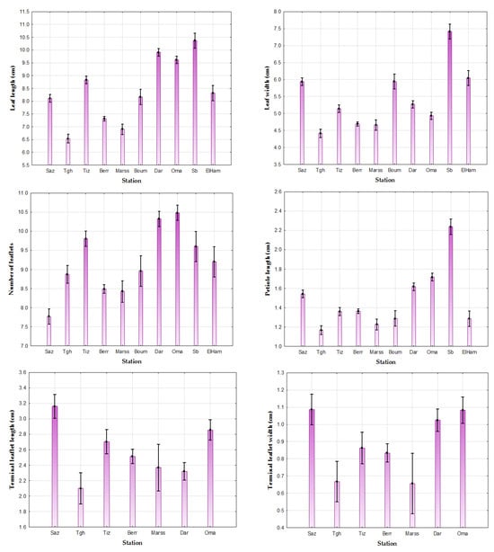 The values of the stomata length vary between 12.71 ± 3.38–42.67 ± 3.38 µm with an average of 26.88 ± 3.38 µm and a coefficient of variation equal to 12.60%, while the width values vary between 11.55 ± 2.96–37.74 ± 2.96 µm with an average of 20.71 ± 2.96 µm (Table 5). The results show that the greatest values of the length and the width of the stomata have been recorded at Dar (respectively, 29.46 ± 4.15 µm; 23.27 ± 2.76 µm), while the Sb station has the lowest values (22.84 ± 2.87µm; 17.18 ± 2.27 µm, respectively) (Table 5). ANOVA revealed a significant difference at the threshold α = 0.05 between the different populations with p < 0.05 (Figure 6). Similarly, the comparison of the means (α = 0.05) revealed the presence of seven groups for the length of stomata (Group 1: Tgh, Marss, and Boum, Group 2: Berr and Tiz, Group 3: Boum and Saz, Group 4: Sb, Group 5: ElHam, Group 6: Oma, and Group 7: Dar); eight distinct groups for stomatal width (Group 1: Marss and Tiz, Group 2: Berr and Oma, Group 3: Oma and Boum, Group 4: Saz and Boum, Group 5: Tgh and Saz, Group 6: Sb, Group 7: ElHam, and Group 8: Dar (Table 5).