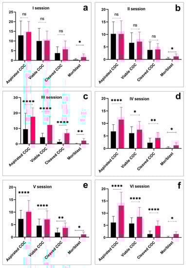 - Monteiro, F.; Batista, E.; Vieira, L.; Bayeux, B.; Accorsi, M.; Campanholi, S.; Dias, E.; Souza, A.; Baruselli, P. Beef donor cows with high number of retrieved COC produce more in vitro embryos compared with cows with low number of COC after repeated ovum pick-up sessions. Theriogenology 2016, 90, 54–58. [Google Scholar] [CrossRef] [PubMed]