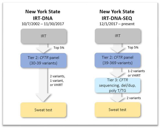 To address these issues, the NYS CFNBS program changed its algorithm in 2017, adding a third tier utilizing next-generation sequencing (NGS) for any infant with one CFTR variant on the second-tier screening or with VHIRT and no CFTR variants on second-tier screening [28] (Figure 1). This innovation was made possible by expanded technical ability and reduced costs to the NBS program. By 2017, NGS technology made it possible to perform rapid, extensive CFTR testing in the state-run NBS lab. Eventually, the 39-variant second tier was expanded to be a targeted second-tier CFTR panel consisting of all CF-causing variants in the CFTR2 database [29]. In addition, the new testing platform was updatable as new pathogenic variants in CFTR were reported and confirmed as CF-causing.