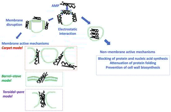 The mechanism of action of AMPs has been a focus of research for many years, since a better understanding of the way these molecules act could allow for the optimization of their function by modifying their primary, secondary, and tertiary structure [,,,]. AMPs can be categorized based on their mechanism of action into those that kill by acting on the membrane causing disruption and those that act by non-membrane-disruptive mechanisms. The membrane targeting of AMPs can be accomplished through receptor association or without receptors. AMPs cross the membrane after achieving a particular threshold concentration and perturb bacterial membrane permeability through pore opening. More specifically, AMPs that act by membrane-disrupting mechanisms do so by forming a toroidal pore or a barrel-stave, or via a carpet-like mechanism, with all these causing membrane disruption that leads to the leak of intracellular contents, thus causing cell death (Figure 1) [,]. In all cases, AMPs accumulate and are appropriately organized on the target cell membrane, a process driven by their hydrophobic nature and the electrostatic interaction of their positive net charge with the negatively charged phospholipids on the cell membrane of the target cell []. The peptide–lipid ratio exerts a determining effect on the delivery of AMPs on the bacterial membrane. For example, AMPs are transferred in parallel into the bacterial membrane at a low peptide–lipid ratio [].