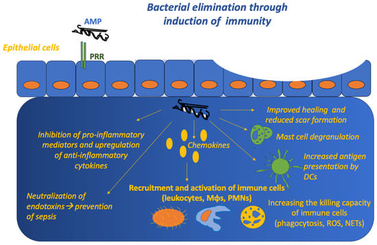 Furthermore, beyond causing direct microorganism killing, AMPs may also have immunomodulatory properties (Figure 2). They are secreted by many different innate immune system cells, such as neutrophils and macrophages. They can intervene in the inflammatory milieu, leading to a more-controlled secretion of proinflammatory cytokines, preventing excessive tissue damage. At the same time, they also promote angiogenesis and reduce the excessive production of ROS [,,,]. More specifically, it has been suggested that AMPs are significant factors that attract and activate different populations of immune cells (e.g., polymorphonuclear cells or macrophages) through chemokines. Moreover, AMPs may suppress the expression of several pro-inflammatory cytokines, exert anti-endotoxin activity, and enhance the microbial killing mechanisms of immune cells, such as phagocytosis or the production of neutrophil extracellular traps (NETs) [,]. In other cases, AMPs exert their action through the alteration of signaling pathways such as p38, extracellular signal-regulated kinase 1/2 (Erk1/2), c-Jun N-terminal kinase JNK mitogen-activated protein (MAP)-kinases, Nuclear factor kappa-light-chain-enhancer of activated B cells (NF-kB), or Phosphoinositide 3-kinase (PI3K)/Protein kinase B (Akt), independently of bacterial ligand binding []. On the other hand, some AMPs, such as LL37, can induce auto-inflammation through the recognition of self-DNA by TLR9, self-RNA by TLR7/8, or double-stranded RNA by TLR3 []. In this regard, LL-37 has been reported to be harmful, allowing mast cell degranulation and consequent histamine release, which in turn leads to vasodilation [] through the activation of signaling pathways such as PI3K/Akt, Erk1/2, and JNK []. Examples of the mechanism of action of AMPs are shown in Table 1 and in more detail in other studies [,].