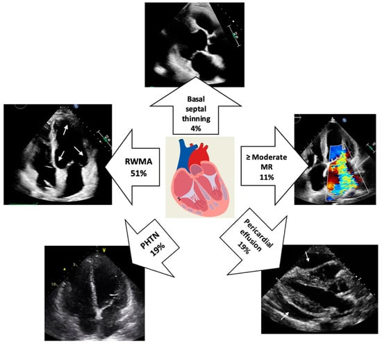 Central illustration: Prevalence of echocardiographic abnormalities in cardiac sarcoidosis. The white arrows indicate multifocal RWMA (top-left image) and global pericardial effusion (bottom-right image). (MR = mitral regurgitation; PHTN = pulmonary hypertension; RWMA = regional wall motion abnormality).