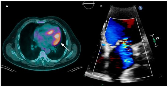 (A) Active cardiac sarcoidosis with FDG uptake extending from the lateral wall to involve the anterolateral papillary muscle (white arrow). (B) The same patient had moderate eccentric mitral regurgitation on transthoracic echocardiography. FDG = fluorodeoxyglucose.