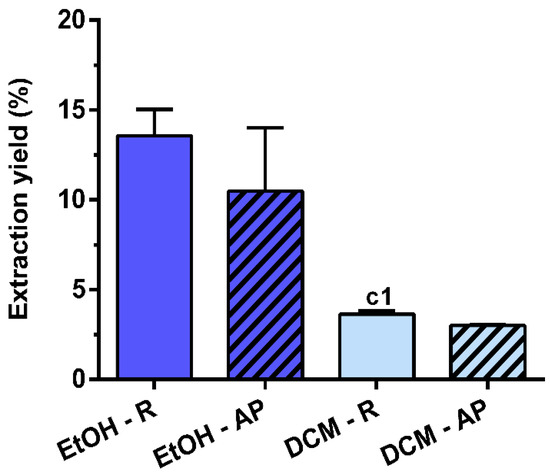 Extraction yield (%) of S. chamaejasme extracts. Statistical significance is 1 (p < 0.0222) in comparison with c (EtOH-R vs. DCM-R). EtOH, ethanol; DCM, dichloromethane; R, roots; AP, aerial parts.