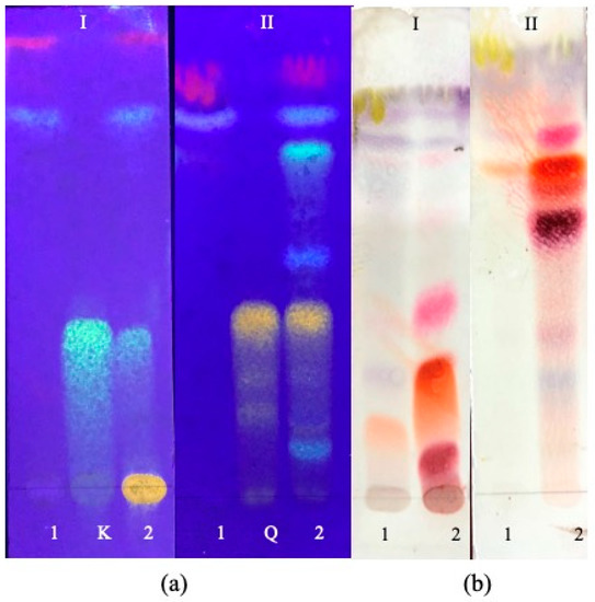 TLC chromatograms of four S. chamaejasme extracts obtained with DCM (1) and EtOH (2) from aerial parts (a) and roots (b) and two standards (K, kaempferol; Q, quercetin-3-O-glucopyranoside). In I and II, the mobile phases used were composed of chloroform and methanol (95:5, v/v) and chloroform, methanol, and water (7:3:0.4, v/v/v), respectively. Chromatograms were sprayed with NP/PEG (a) and revealed using UV (365 nm) or vanillin–sulfuric reagent (b) and evaluated in visible light.