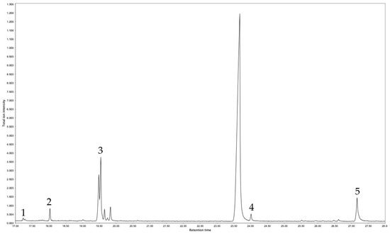 The GC-MS allows unequivocal identification of the chemical compounds present in S. chamaejasme DCM-R extracts. From the ten chromatographic peaks present in DCM-R extract (Figure 3), five chemical compounds were identified (Table 2). DCM-R was composed of two fatty acids (palmitic acid and 9-Octadecenoic acid), one fatty alcohol (1-hexadecanol), and one triterpenoid (squalene). The last identified peak ((Stigmast-5-ene, 3β-(trimethylsiloxy)) corresponds to the derivatized form of beta-sitosterol.