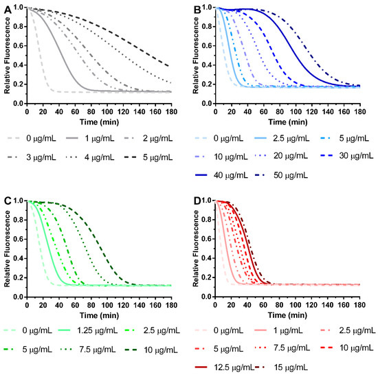 where AUCextracts is the AUC obtained for the extracts at different concentrations, and AUCblk is the AUC calculated in the solution without extract (blank). The AUC was calculated by integrating the relative fluorescence curve as a function of the time using GraphPad Prism 6 software. The IC50 was calculated as previously described.