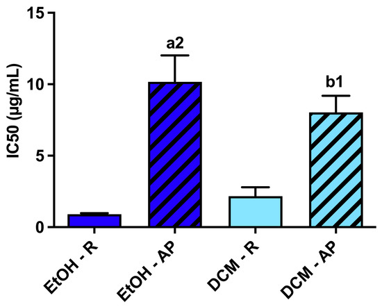 Half-maximal inhibitory concentration (IC50, μg/mL) of the different S. chamaejasme extracts against ROO●. Statistically significant differences are 1 (p < 0.0011) and 2 (p < 0.0001) in comparison with a (EtOH-R vs. EtOH-AP) and b (DCM-R vs. DCM-AP). EtOH, ethanol; DCM, dichloromethane; R, roots; AP, aerial parts.