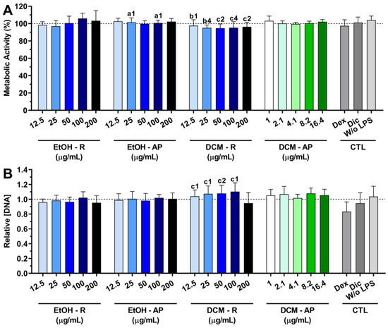 Metabolic activity (A) and relative DNA concentration (B) of LPS-stimulated macrophages treated with different concentrations of S. chamaejasme extracts and clinically used anti-inflammatory drugs (Dex, dexamethasone; Dic, diclofenac—both 10 μM) for 24 h of culture. The dotted line represents the nontreated condition (0 μg/mL) for each assay. There are no statistically significant differences in comparison with positive control (non-treated LPS-stimulated macrophages). Statistically significant differences are 1 (p < 0.01), 2 (p < 0.001), and 4 (p < 0.0001) in comparison with a (EtOH-R vs. EtOH-AP), b (DCM-R—12.5 and 25 µg/mL vs. DCM-AP—16.4 µg/mL), and c (EtOH-R vs. DCM-R). EtOH, ethanol; DCM, dichloromethane; R, roots; AP, aerial parts; CTL, controls.