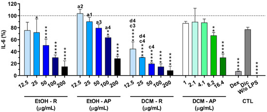 IL-6 amount (%) produced by LPS-stimulated macrophages cultured in the presence of S. chamaejasme extracts at different concentrations (12.5, 25, 50, 100, and 200 µg/mL for EtOH-R, EtOH-AP, and DCM-R and 1, 2.1, 4.1, 8.2, and 16.4 µg/mL for DCM-AP) and clinically used anti-inflammatory drugs (Dex, dexamethasone; Dic, diclofenac—both 10 µM) for 24 h. Statistically significant differences are * (p < 0.0216), ** (p < 0.0093), and **** (p ≤ 0.0001) compared to the positive control (non-treated LPS-stimulated macrophages) and 1 (p < 0.01), 2 (p < 0.001), 3 (p < 0.0001), and 4 (p < 0.0001) in comparison with a (EtOH-R vs. EtOH-AP), c (EtOH-R vs. DCM-R), and d (EtOH-AP—12.5 and 25 µg/mL—vs. DCM-AP—16.4 µg/mL). EtOH, ethanol; DCM, dichloromethane; R, roots; AP, aerial parts; CTL, controls.