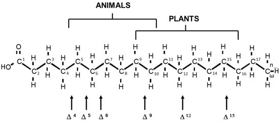 Animals can elongate and introduce double bonds into fatty acyl chains through well-known mechanisms [,], which differ between species and even between tissues. Although plants can introduce double bonds between an existing double bond and the terminal methyl group, animals can insert new double bonds only at the carboxyl end of the chain, and therefore cannot alter the n-family designation. Consequently, the n-family of the different fatty acids in our body cannot be modified endogenously and depends only on their dietary intake. Conjugated polyunsaturated fatty acids are those in which at least one pair of double bonds is separated by only one single bond. The introduction of conjugated double bonds is extremely rare in high animals, where most pairs of double bonds are separated by CH2 groups. Consequently, as shown in Figure 1, animals can insert double bonds at positions Δ4, Δ5, Δ6 and Δ9, whereas plants can insert at positions Δ9, Δ12 and Δ15. However, microscopic algae like diatoms and Euglena, are able to desaturate on either side of an existing bond, allowing the insertion of double bonds in positions Δ5, Δ6, Δ9, Δ12 and Δ15. Although several promising sources of EFAs have emerged [], the consumption of oily fish is the main source of PUFAs in human nutrition and is commonly used for supplement production.