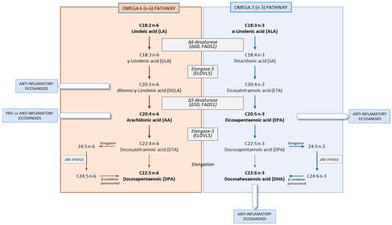 Under normal conditions, in mammals, there is an alternative activity of fatty acid elongation and desaturation that results in the synthesis of n-6 and n-3 LCPUFAs, from their 18-carbon unsaturated EFA precursors from the diet (Figure 2). This pathway requires the activity of desaturation and elongation reactions that are followed by partial β-oxidation degradation reactions that take place in peroxisomes [,]. The levels of n-6 LCPUFAs also have the ability to impact n-3 LCPUFAs status and vice versa. This is due to the competition between n-6 and n-3 LCPUFAs on the delta-6 desaturase (Δ6D), for the enzymatic conversion of both of the EFA precursors, LA and ALA, to their respective long-chain derivatives. Moreover, LA competes with ALA for Δ6D, and as a result, high levels of LA have the potential to reduce the efficiency of the endogenous synthesis of n3- LCPUFAs from ALA. Also, it has been suggested that increasing the dietary intake of ALA could provide an alternative to fish (or fish oil) intake for increasing n-3 LCPUFAs, although the efficiency of this process in humans is generally low []. In addition, it has been suggested that reducing LA and/or increasing ALA intake in humans, could increase EPA and, to some extent, DHA levels [], although there is a need for well-controlled studies to corroborate this. Besides the diet, hormones [] and age [] modulate the desaturation and elongation processes.