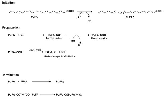 In the case of non-enzymatic oxidation, the process can be considered autoxidation, the reaction being mediated by free radicals, which may be formed under the influence of traces of peroxides, transition metals, ultraviolet or ionizing radiation and other factors. As summarized in Figure 3, a resonance hybrid is formed, which is already a free radical that may react with oxygen to form peroxy-radicals (PUFA-OO•), which may abstract a hydrogen atom from another substrate, converting the peroxy radicals to hydroperoxides (PUFA-OOH). Under certain conditions, the hydroperoxides decompose by homolysis, resulting in radicals that may initiate a new peroxidation chain. The termination of the process occurs when two hybrid radicals are coupled, forming a product that is no longer a free radical. The formation of both hydroperoxides and lipid peroxide degradation products may cause a disturbance to the structure of the cell membrane [].