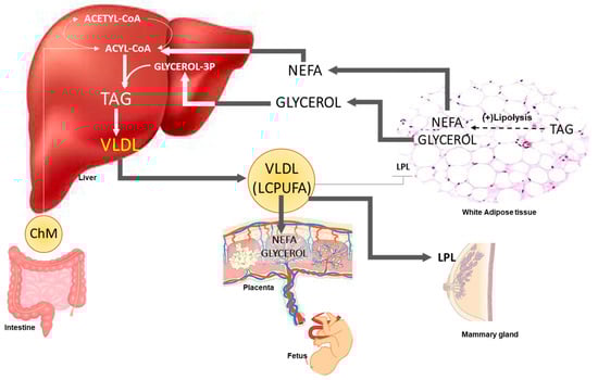 Schematic view of main lipid metabolic adaptations taking place during late pregnancy. A decline in white adipose tissue lipoprotein lipase activity (LPL) occurs, whereas there is an increase in lipolytic activity. The products, in the form of non-esterified fatty acids (NEFAs), including long-chain polyunsaturated fatty acids (LCPUFAs) accumulated at earlier stages of gestation and glycerol, mainly travel to the liver where, among other metabolic fates, they are used for the synthesis of triacylglycerols (TAGs), which are released to the circulation as components of very-low-density lipoproteins (VLDL), a process which is very active in late pregnancy. Plasma VLDL and chylomicrons (ChM) derived from intestinal gut absorption arrive at the placenta, which has the appropriate biochemical machinery to take up these lipoproteins and release the LCPUFAs that are carried into the fetal circulation. Also, close to parturition, an induction of LPL occurs in mammary glands, causing a considerable uptake of TAGs from the lipoproteins in the maternal circulation by this organ, which uses the LCPUFAs it takes up for milk synthesis.