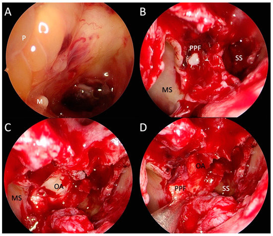 Photographs of transnasal endoscopic surgical treatment of invasive fungal rhinosinusitis causing right-sided orbital apex syndrome, Horner syndrome and pterygopalatine fossa infection. (A): right sphenoid sinus (SS) after sphenoidotomy, with polypoid (P) mucosa on its lateral wall obstructing lateral recess of sphenoid sinus and microabscess (M) on the sphenoid sinus floor; (B): view after right-sided extended middle meatal antrostomy showing maxillary sinus (MS), sphenoethmoidectomy and drainage of pus from pterygopalatine fossa (PPF); (C): decompression and drainage of the orbital apex (OA); (D): right pterygopalatine fossa and orbital apex after the decompression and drainage.