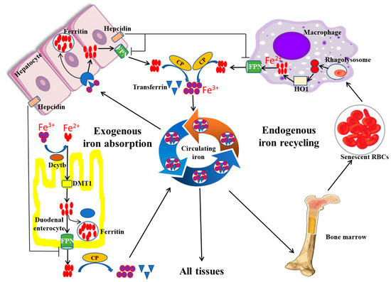 Under physiological conditions, there are two main sources of iron absorption in the body, namely endogenous iron absorption and exogenous iron absorption (Figure 1). Endogenous absorption is mainly from the recycling of iron from senescent erythrocytes. In the process of clearance of aging or damaged erythrocytes, macrophages phagocytose the erythrocytes and decompose heme, a component of hemoglobin with iron bonded, using heme oxygenase 1 (HO-1) to release iron, which can be recycled back into circulation by the iron exporter ferroportin (FPN), a transmembrane protein on the cell surface (Figure 1). Exogenous iron absorption mainly refers to dietary iron. Generally, about 1~2 mg of iron, in the form of either heme iron (Fe2+) or non-heme iron (Fe3+), is absorbed daily by duodenal enterocytes through different mechanisms (Figure 1). Fe2+ is directly absorbed in the apical surface of enterocytes via iron transport protein, divalent metal transporter 1 (DMT1), whereas Fe3+ is not bioavailable and needs to be converted to Fe2+ by duodenal cytochrome B (DcytB), a converting enzyme, before being absorbed by the apical membrane of duodenal enterocytes via DMT1 [16]. Absorbed iron in duodenal enterocytes can be transported through FPN into the circulation to play its physiological role [17].