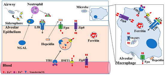 Proposed iron regulation in lung. The level of iron in alveolar epithelial cells is mainly regulated by TfR1, DMT1, ZIP8, LfR, and FPN receptors. Alveolar macrophages, through phagocytosis of bacteria, play an important role in lung defense response. Fpn, ferroportin; ZIP8, zinc transporter SLC39A8; Lfn, lactoferrin; LfR, lactoferrin receptor; DMT1, divalent metal transporter 1; TfR1, transferrin receptor 1; NRAMP1, natural resistance–associated macrophage protein 1NGAL, neutrophil gelatinase–associated lipocalin (modified according to Zhang et al., 2019 [35]).