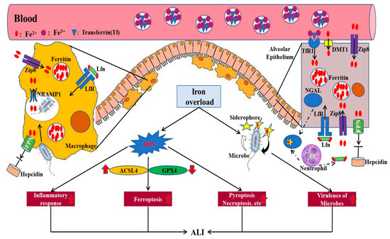 The detrimental effects of iron overload in the development of ALI. Overloaded iron in the lung, including alveolar epithelium and macrophages, can accelerate the production of ROS, thus inducing the inflammatory response, ferroptosis, pyroptosis, and necroptosis of pulmonary epithelial cells. In addition, excess iron can promote the virulence of microbes aggravating the development of ALI. FPN, ferroportin; NRAMP1, natural resistance–associated macrophage protein 1; ZIP8, zinc transporter SLC39A8; Lfn, lactoferrin; LfR, lactoferrin receptor; DMT1, divalent metal transporter 1; TfR1, transferrin receptor 1; NGAL, neutrophil gelatinase–associated lipocalin; ROS, reactive oxygen species; GPX4, glutathione peroxidase 4; ACSL4, Acyl-CoA synthetase long-chain family 4 (modified according to Zhang et al., 2019 [35]).