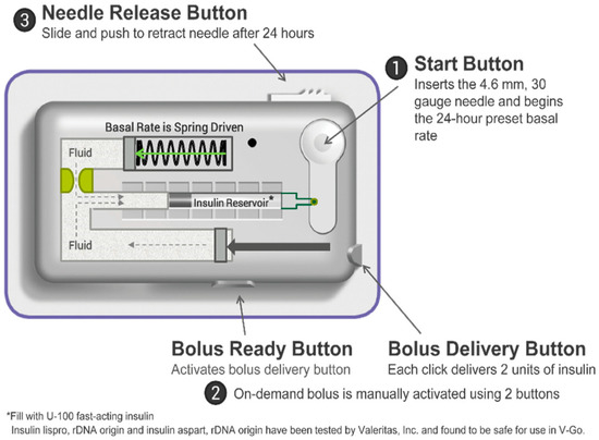 85. Zeidan, T.; Nikkel, C.; Dziengelewski, B.; Wu, S.; Chen, A.M.H. Clinical Evaluation of Basal-Bolus Therapy Delivered by the V-Go® Wearable Insulin Delivery Device in Patients with Type 2 Diabetes: A Retrospective Analysis. Pharmacy 2020, 8, 215. [Google Scholar] [CrossRef]