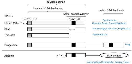 TPPP proteins in which the full or partial p25alpha domain is present can be grouped according to the nature (completeness) of the domain [10] (Figure 1). The long (animal-type) TPPP is specific for Opisthokonta and is found in almost all animals, some flagellated fungi, and Choanoflagellate Monosiga brevicollis [10]. Some flagellated fungi contain fungal-type TPPPs (single copy or two paralogs) that have both a full domain and a partial domain (the C-terminal part), so that the Rossmann-like motif can be found twice in them [14]. The short TPPP is found in algae and protists (Alveolata, Euglenozoa), the C-terminal part of which is incomplete, while Rossmann-like motif is also absent [10]. In Endopterygota (Holometabola), insects undergoing metamorphosis, in addition to the long TPPP, there is a form in which the entire C-terminus is missing (“truncated” TPPP) [15]. Placozoan Trichoplax adhaerens (the only animal which lacks TPPP), Myzozoa (apicomplexans, chrompodellids, dinoflagellates, perkinsids), and some flagellated fungi contain apicortin in which the C-terminal portion (partial p25-alpha) is attached to a DCX domain [16,17].