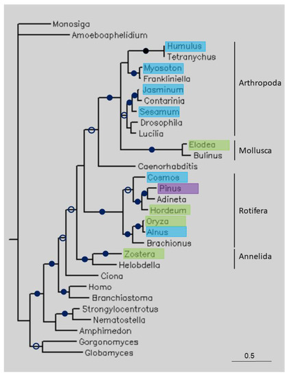 Where the identity and coverage of the sequences is not as high as in the above-mentioned cases, the explanation for the presence of unexpected sequences in genomes/transcriptomes is not as straightforward. These similarities may be due to different factors: they can be true orthologous sequences (conservation) or they may be the consequence of horizontal (lateral) gene transfer (HGT) or contamination of sequencing data. Phylogenetic analysis can help to distinguish between these possibilities. If the homology between plant and other, e.g., animal or fungal, sequences was due to orthology, we would expect plant species to be located outside of animals or fungi in the tree. If the plant sequence is located within another clade, then contamination or HGT may have occurred. HGT does not often happen between higher eukaryotes, such as between distantly related organisms such as arthropods and plants, although it is difficult to rule it out completely. Recently, these kind of reports of HGT have been accumulating, but in the opposite direction, from plants to arthropods [24]. However, a high sequence identity usually suggests contamination, as HGT would have occurred some time ago and the sequence may have changed significantly since then. For the long TPPPs, the plant sequences were located within various animal clusters (Figure 3), confirming that contamination occurred.