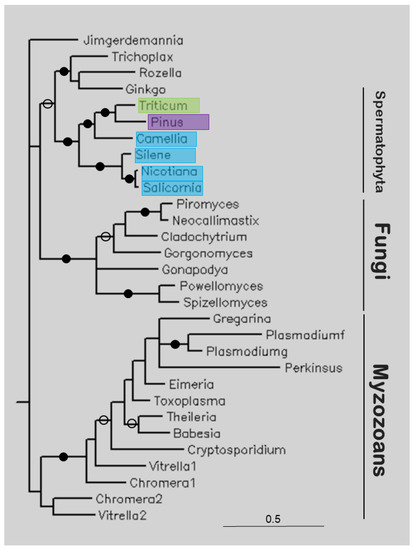 The study of apicortins seems to represent another scenario. This protein has been found in the placozoan animal T. adhaerens [25], in flagellated fungi [14], and in myzozoans (Apicomplexa [25], chromerids [16], Perkinsozoa [26], and dinoflagellates [17]). In the present study, it was found at nucleotide level, as TSA or EST. The majority of the hits contained the full sequence of apicortin (Camellia sinensis, G. biloba, N. tabacum, Triticum polonicum). Of these species, only ginkgo (G. biloba) has cilia; its spermatozoa are moved by thousands of cilia [27]. Our phylogenetic analysis showed that the Spermatophyta sequences form a separate clade that is sister to Fungi, and these clades together are sisters to myzozoan apicortins (Figure 5) (G. biloba sequence, with two other apicortins, is a sister position to the other Spermatophyta sequences). Within the Spermatophyta clade, eudicotyledons are separated from monocotyledons (Liliopsida). The identity values of plant sequences compared to other apicortins are about 50%. There are apicortins of animal, fungal, and chromerid origin among the most similar hits. Since the plant species are outside of animals or fungi in the tree, it can be assumed that these sequences are not the results of contamination or HGT but represent genuine apicortins that occur as a kind of relic in this non-flagellated species. A similar phenomenon occurs in non-flagellated Mucoromycota fungi [14].