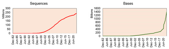 The recent stats release of GenBank reports having 16.7 trillion nucleotide bases for 1.7 million whole genome sequences (as of June 2022) (GenBank and WGS Statistics (ncbi.nlm.nih.gov)) (Figure 2). Of which, green plant data (Viridiplantae) alone have 93.8 million sequences from 2324 genomes (including variants of the same plant species genome), including genomic DNA/RNA for 33.4 million sequences, mRNA for 41.5 million sequences, and rRNA for 80,709 sequences.