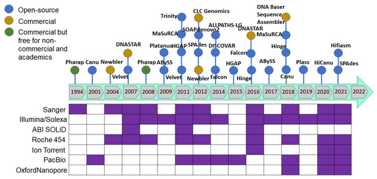As sequencing technology evolved, assembly approaches also had to evolve. The Celera Assembler and Arachne assemblers were developed to handle genomes of the fruit fly (Drosophila melanogaster) and human genome in 2000–2003; later, AMOS was launched under an open-source framework. These assemblers were developed based on overlap–layout–consensus on an overlap graph [120] in which the nodes were the reads and the edges represented the shared sequence between reads. This type of assembler is suitable for assembling FGS technology sequencing reads produced by the dideoxy termination method (Sanger sequencing). As massively parallel high-throughput sequencing technology was developed to produce millions of bases (in SGS), the read size became smaller and more error-prone with higher genome coverage. The leading Illumina technology of SGS/NGS sequencing technology yields 35–150 bp length paired-end reads from fragments with a 200–300 bp insert size. Such high-throughput data required a new approach, and thus de Bruijn graph-based assembly was developed [121,122] where the nodes represent fixed-length strings drawn from a larger set of strings, and the edges represent perfect shared sequences. However, de Bruijn graph-based assemblers have difficulties handling sequencing errors and need high computational power (100+ Gb of memory). The challenge with uneven genome coverage and reads too short to span repeated regions can be addressed by a combination of many short reads and fewer longer reads or mate–pair reads (Sanger, 454 and Illumina sequencing methods). Multiplex de Bruijn graphs automate the assemblies of long HiFi reads [123], and the recently updated Minimap2 version can be used for long read assembly [124]. Newbler was the first assembler released in 2004 to assemble the 454 sequence data followed by a hybrid version of the MIRA assembler for 454 and mixed with Sanger reads. After upgrading the Illumina sequence technology to produce from the initial 36 base-length read to reads over 100 bases in length, the produced sequence was suitable for de novo assembly. After the release of the SHARCGS assembler for Solexa reads, other assemblers were released and became the most popular assembly tools (Figure 4 and Figure 5).