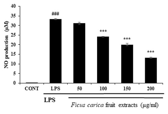 Effect of F. carica fruit extracts on nitric oxide production of RAW 264.7 cells. Ficus carica fruit extracts significantly inhibit NO production of LPS-stimulated RAW 264.7 cells in a dose-dependent manner. All data are expressed as mean ± SD *** p < 0.001 compared with control group, ### p < 0.001 compared with LPS group. All experiments were performed in triplicate.